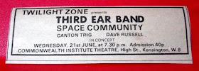 "International Times" announced: "A group temporarily without a recording contract - Third Ear Band. It seems that EMI's "progressive underground label" (or its overlords) doesn't see fit to employ "pot smokers" amongst its roster of artistes. Dear me, we don't want people like Syd Barrett to be influenced in any way, do we?"